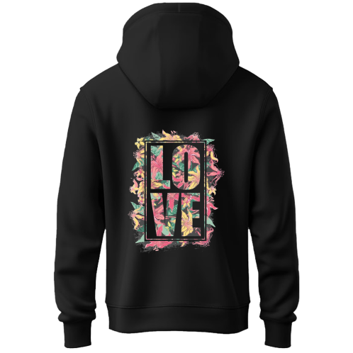 Florals, but make it bold. The Love Hoodie features a striking back print where vibrant blooms meet geometric typography. Set against a premium black canvas, it’s a cozy essential that balances soft aesthetics with street-ready vibes. Perfect for layering or making a statement from behind.