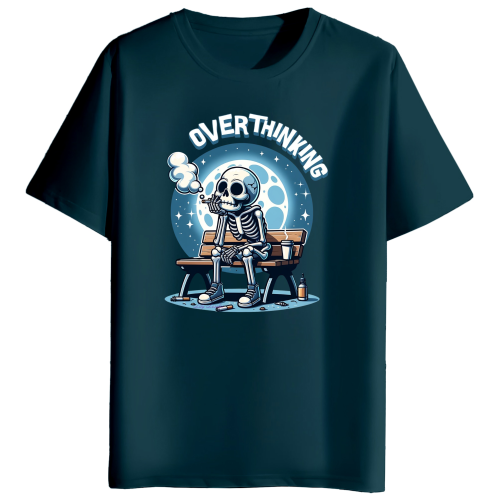 Caught in a loop? Join the club. The Overthinker tee captures that 3 AM vibe perfectly. Featuring a skeleton lost in thought on a park bench under a full moon, this design blends dark humor with a chill aesthetic. With the bold "OVERTHINKING" header, it’s the ultimate uniform for those who just can't turn their brain off.